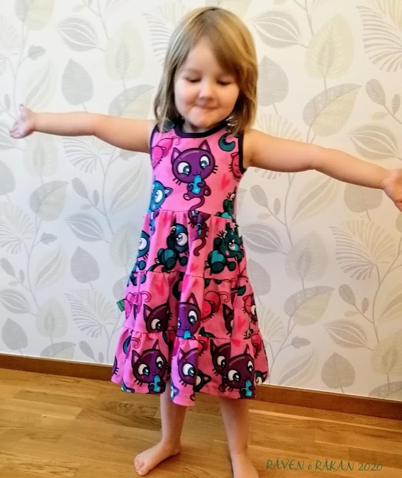 Jag valde att sy ärmlösa klänningar som man kan förstärka med långärmad tröja under om det är kallt. Den större klänningen kompletterade jag med sidfickor ( från GPD Danica dress) för att få den perfekta sommarklänningen ;-). Den mindre är sånär som på bakstycket gjort helt i återbrukade tyger.
